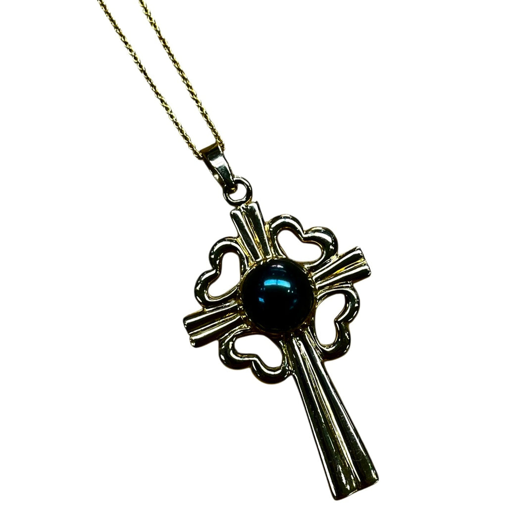 This Cross Pendant holds a beautiful Black Pearl set in 14 Karat Yellow Gold. Chain is sold separately.