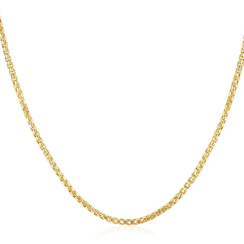 From everyday wear to special occasions, make this box link chain necklace your must-have. This basic piece, meticulously crafted from 14kt gold-plated sterling silver, is perfect for stacking or adding your special charms.