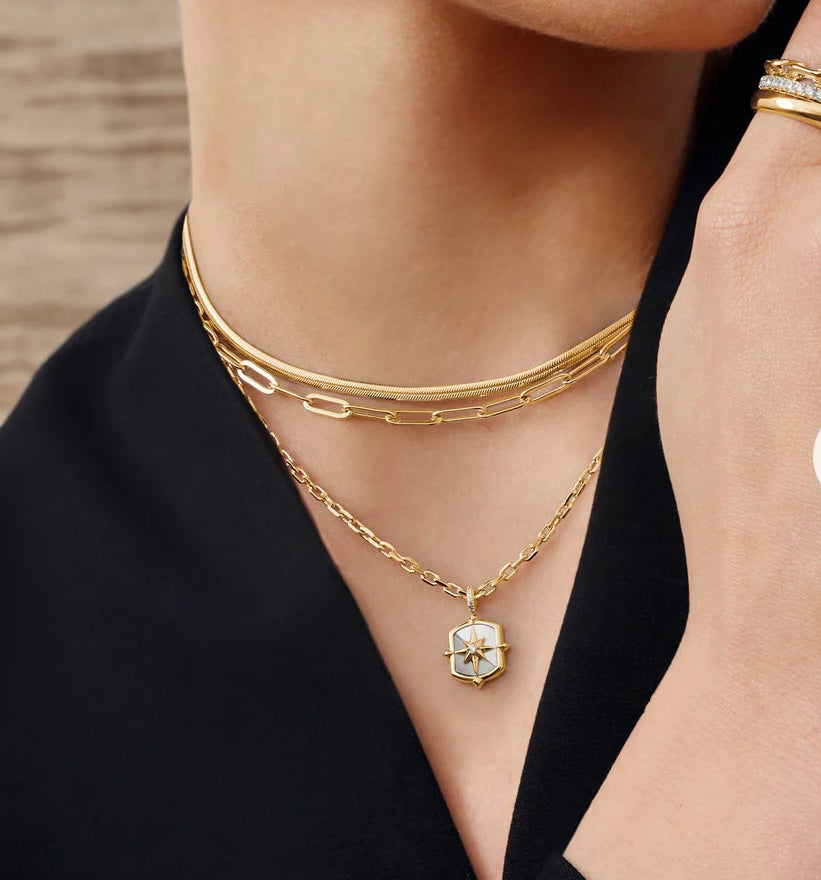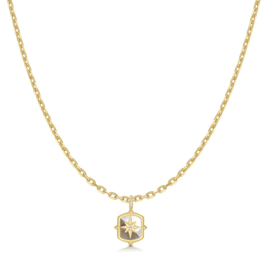 Embrace the latest dark aesthetic trend with this edgy necklace. The pendant features an eight-pointed star on a mother-of-pearl base, adding a bold and unique touch. Stack it with other chains to create a look that's uniquely yours and sets the fashion pace.