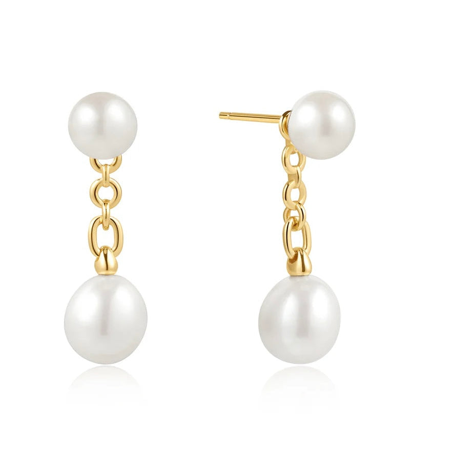 Glam up your look with our pearl drop earrings. The chain motif connects each pearl, making these pieces a classic addiction to your wardrobe. Wear the pair alone or stacked with other studs, hoops and ear cuffs, you will definitely make a style statement.