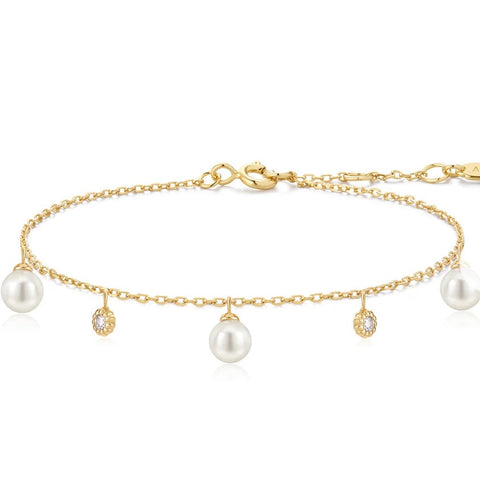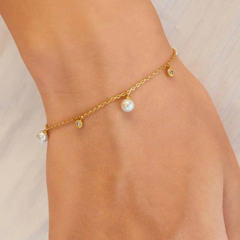 For the woman who exudes effortless elegance with a spark of playful charm. This bracelet features lustrous shell pearls and brilliant cubic zirconia stones suspended from delicate stations along the chain. Designed to layer effortlessly with delicate chains, it creates a truly captivating look. Perfect for parties and special gatherings, these pieces add just the right amount of shine to your most memorable moments — whether you're dressing up for a celebration or selecting a gift for someone special.