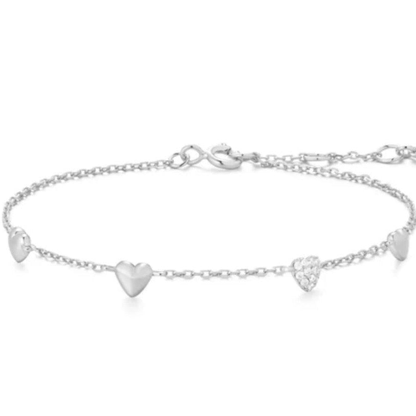 For the romantic soul who treasures life's special moments. This bracelet features a series of gently domed heart stations, one pavé-set with cubic zirconia stones while the others showcase a polished smooth finish. Each heart reflects the light with a playful gleam, turning everyday wear into your personal celebration—perfect for layering with your favorite station chains for a touch of whimsical charm.