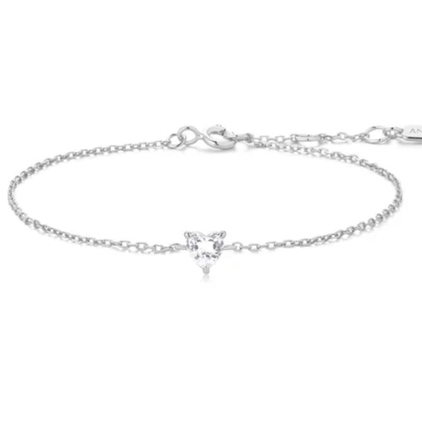For the romantic soul who treasures life's special moments. This bracelet features a single heart-shaped cubic zirconia, reflecting light with a soft glow. Layer this bracelet with station chains to create a melody of refined grace, celebrating life's serendipitous moments with every glimmer.