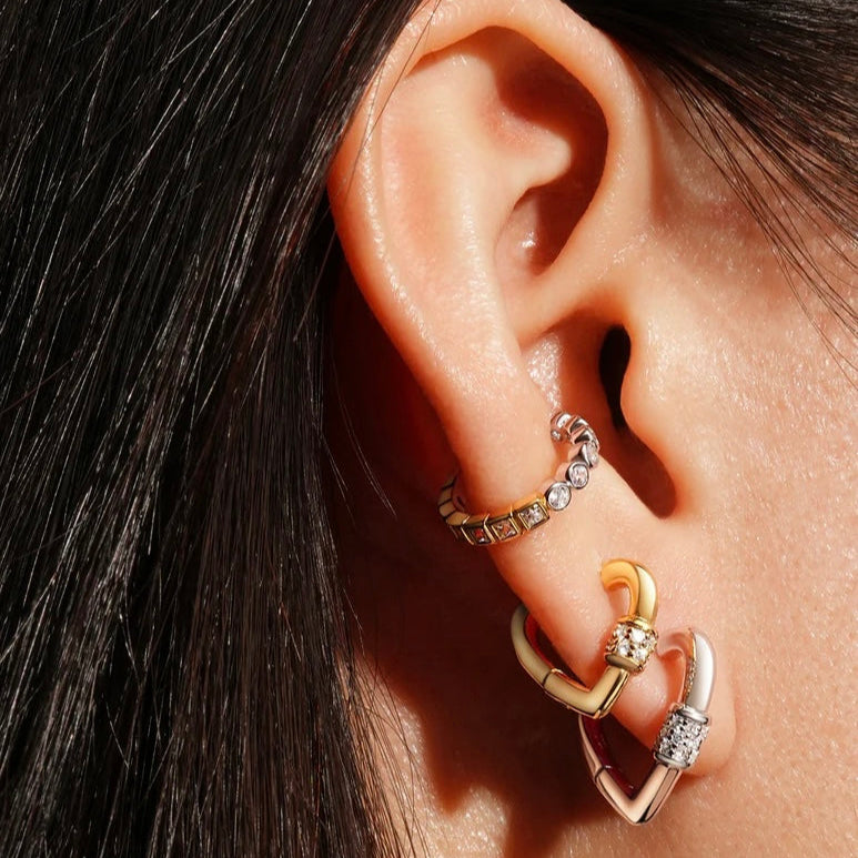 Inspired by the rhythm of life, this two-tone ear cuff allows you to create your own melody, just as a poet weaves words into a poem. Style it with huggies, hoops, and studs to complete your look. Ideal for those who appreciate subtle beauty and spiritual enjoyment.